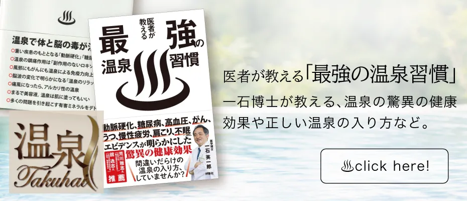温泉宅配は、肩こり・不眠・血行障害改善や美肌効果だけではありません!免疫力アップや成人病予防にも…。医学博士の一石先生の書籍「最強の温泉習慣」の中に書かれた、先生が教えて下さる「驚異の温泉の健康効果」を一部ご紹介いたします。